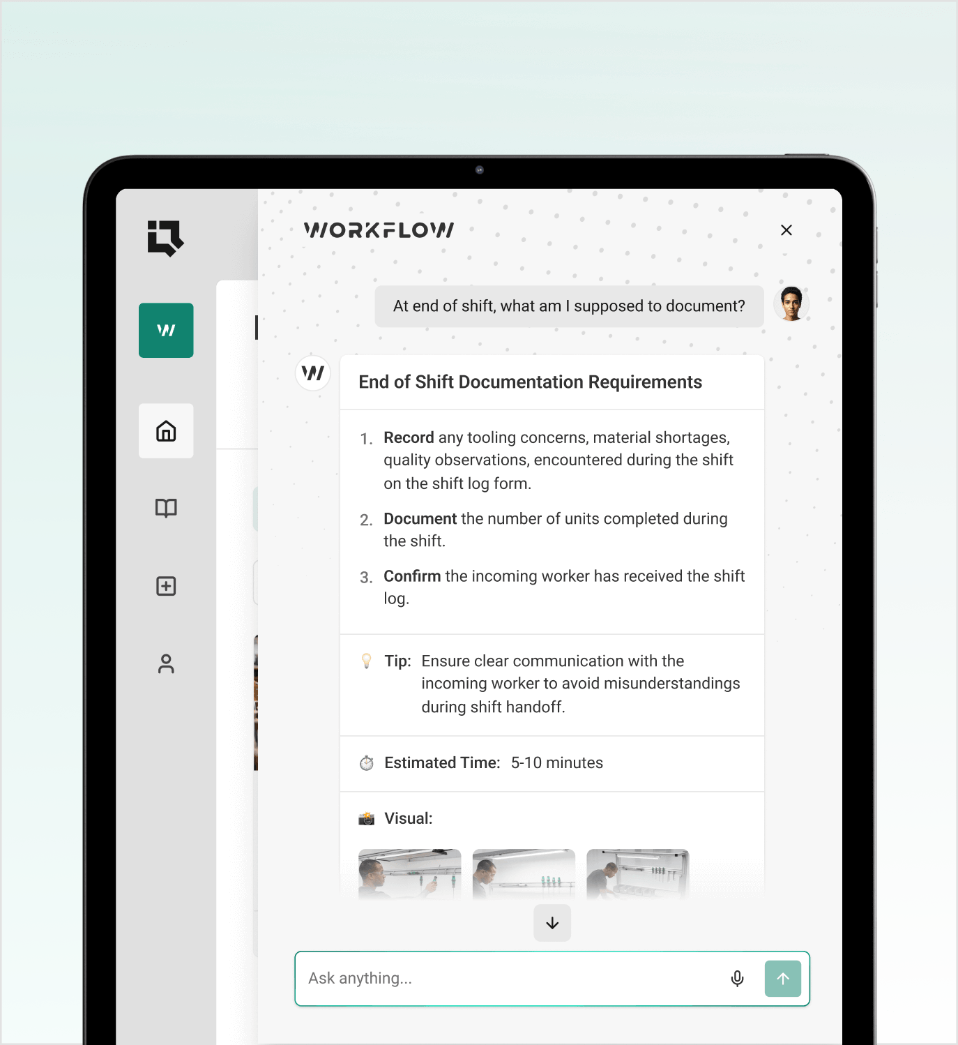 Workflow Assistant automatically includes relevant images, diagrams, or reference visuals from your procedures, making complex tasks easier to follow.