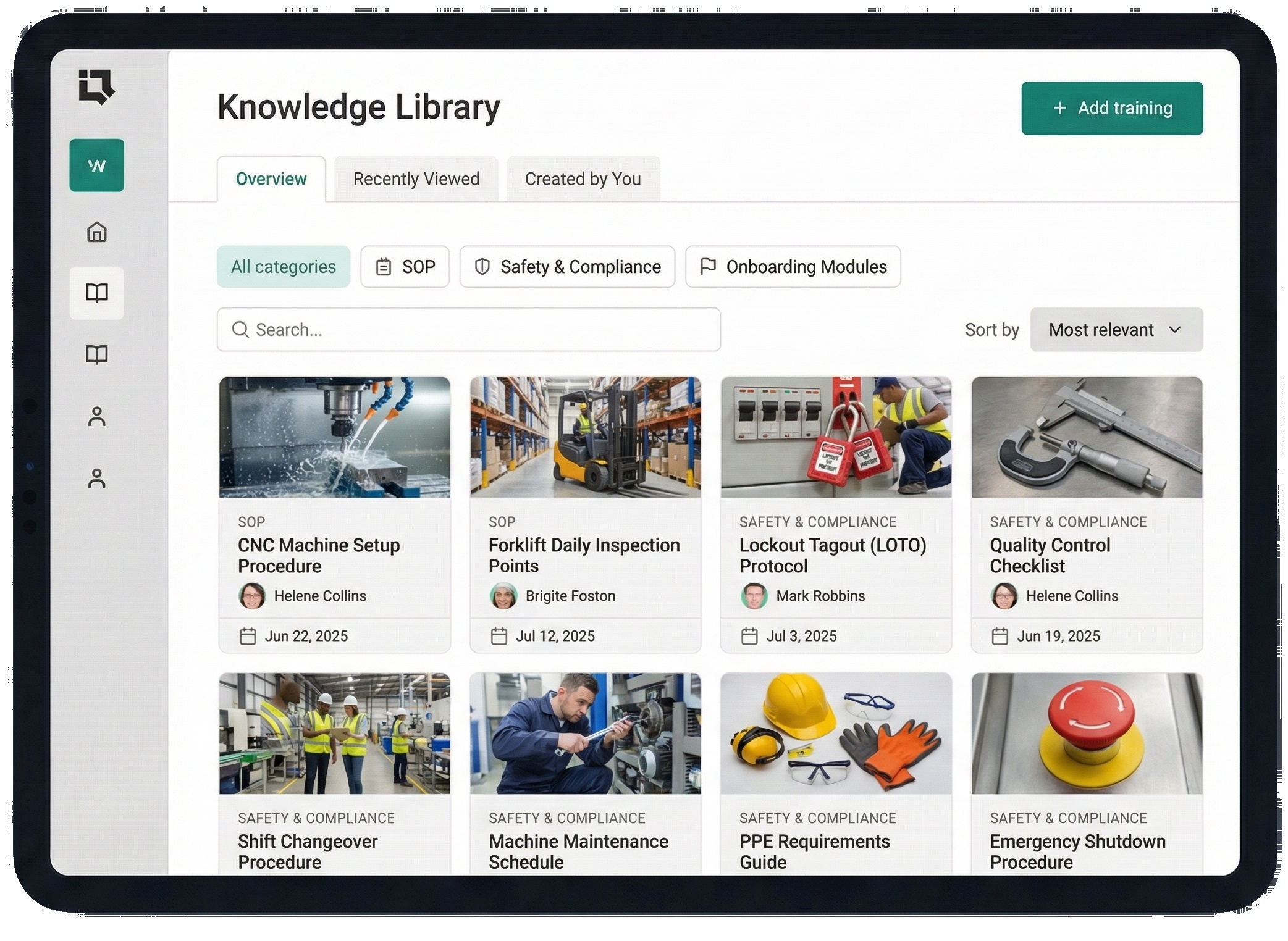 New hires train on the same work instructions they will follow on the floor. They learn the verified way to run each station without weeks of shadowing experienced operators.