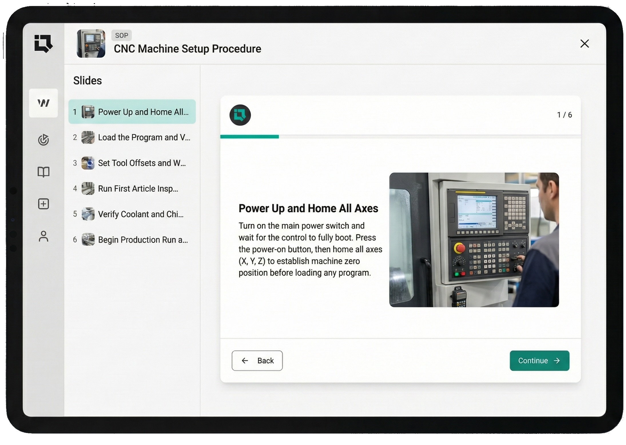 Every operator gets the right procedure at every machine. Reduce downtime, cut rework, onboard faster.