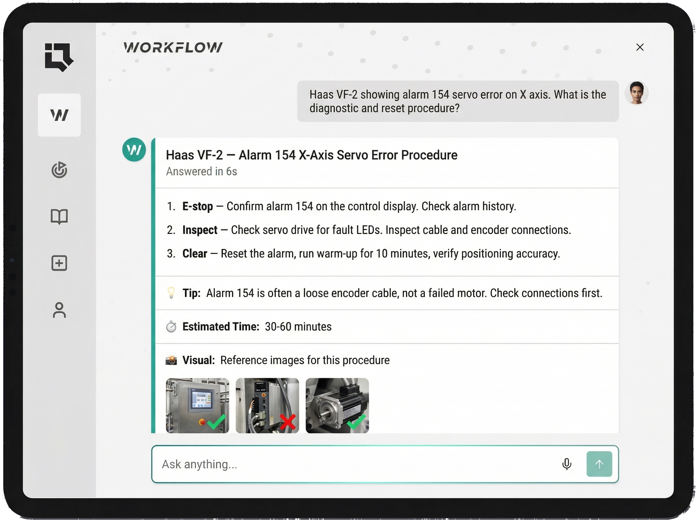 When something goes wrong at a station, your operator asks a question and gets the exact steps to resolve it. No stopping the line, no waiting for a supervisor to walk over.